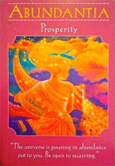 Message from Abundantia: “The Universe is pouring its abundance out to you. Be open to receiving. Asking for help is a sign of strength, not weakness. You are very powerful, and I am here to support your growing power. It is right for you to receive this help, as we function as a team. I have heard your prayers, worries, and affirmations. I am pouring my cornucopia of prosperity upon you now, so expect unforeseen windfalls and gifts. Notice the new ideas, feelings, and visions within you. This guidance gives you clear direction about your actions to take in conjunction with my assistance. Together, we are unstoppable!”